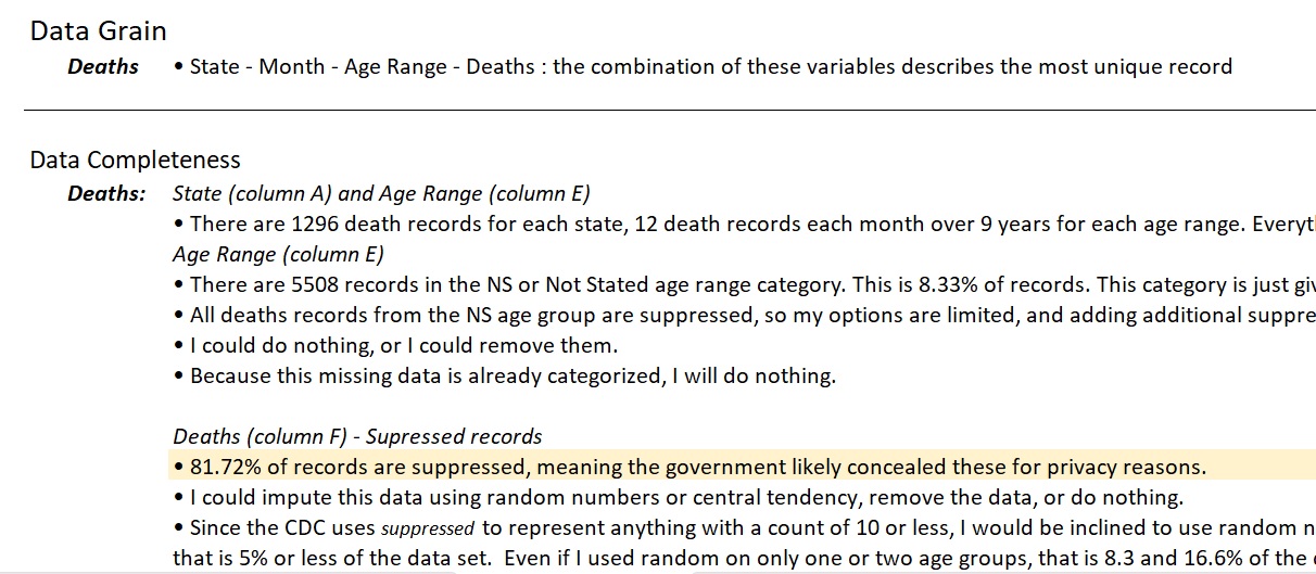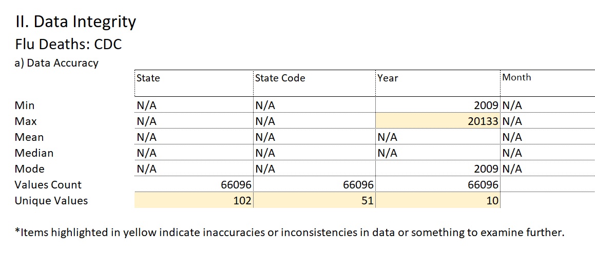 When addressing data integrity issues, one of the most important things I did was use Excel formulas to look for extreme values, check value counts, and ensure the number of unique values had expected counts. One of the data integrity issues seen below is the presence of too many state names in the original CDC Influenza Deaths data set. That is because both state names and abbreviations were used. This was later changed, so the data set only included full state names. During the data quality checks, I primarily focused on checking for missing values and duplicate records. Here, I found that there were many suppressed records in the original CDC Influenza data set in all age groups except the top 2-3 oldest age categories. This is because the government suppresses data when there are fewer than 10 records because of privacy issues. I imputed the median of 10, which is 5, for these records. In reality, the death rate for these records is likely lower, just to keep in mind when viewing the recommendations and visualizations later in this case study.